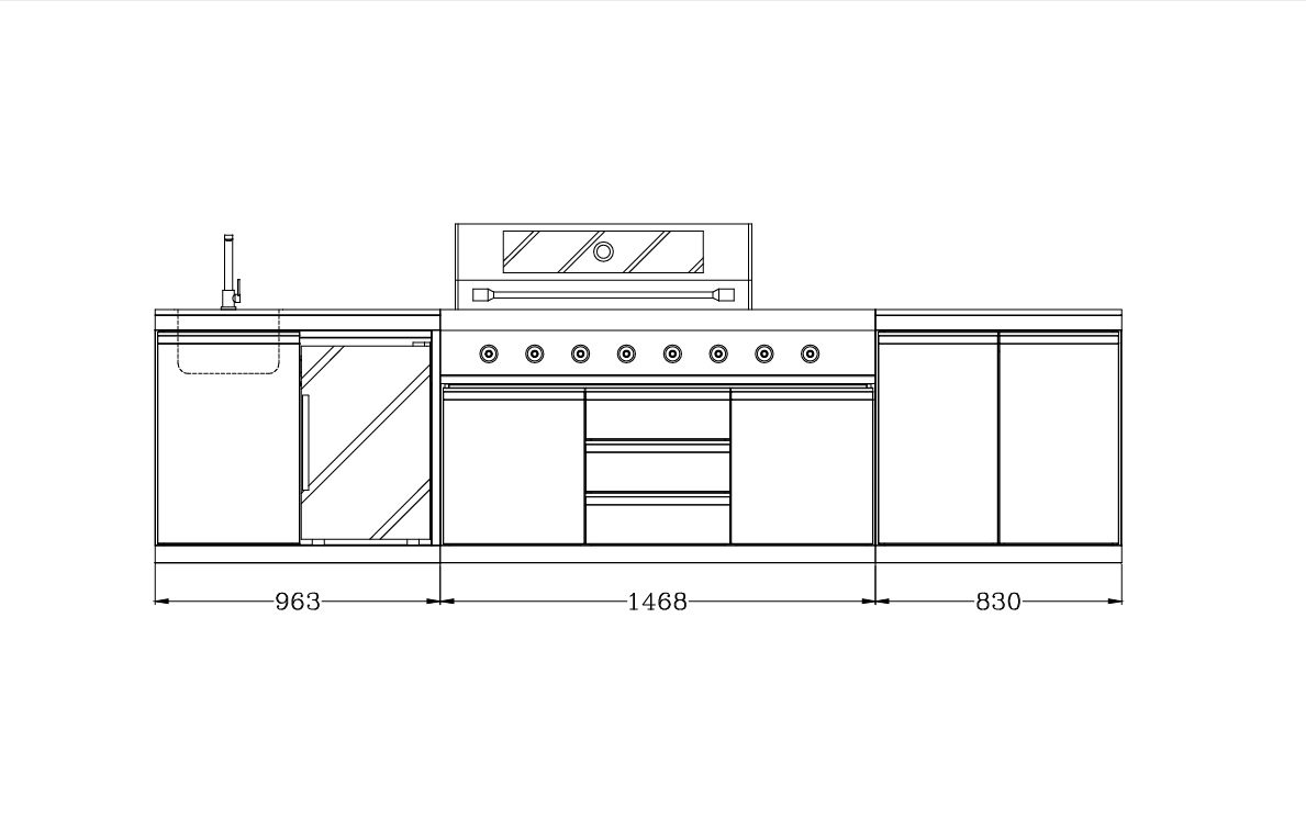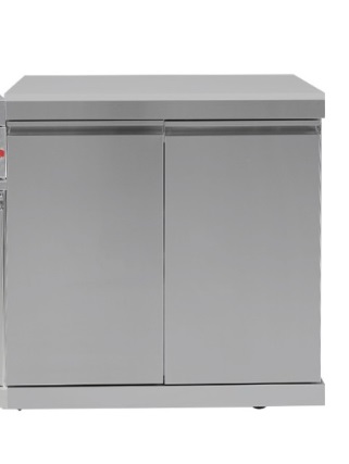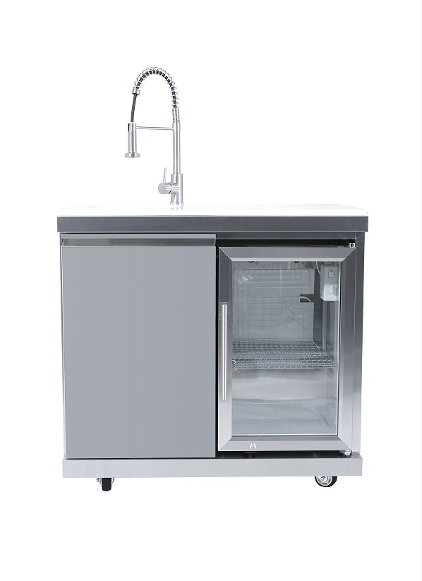 Prostostoječi hladilnik čistega, sodobnega dizajna z zaključki v črni barvi. Velik hladilnik, v katerem so lahko sestavine in pijače hladne in pri roki, medtem ko pečete na žaru. Ima prostorno prostornino 140 litrov, 1 vrata, 3 velike police iz nerjavečega jekla, kompresorsko hlajenje in lahko ohladi do 1°C. Ponaša se tudi z avtomatskim odmrzovanjem ter tremi plastmi kaljenega stekla. Njegova mehka LED osvetlitev prispeva k ambientu zunanjega prostora po sončnem zahodu. Modul vsebuje še omarico za shranjevanje. Pred in po uporabi žara potrebujete tekočo vodo za umivanje rok in izpiranje zelenjave in mesa ter delovni prostor za sekljanje in rezanje hrane.